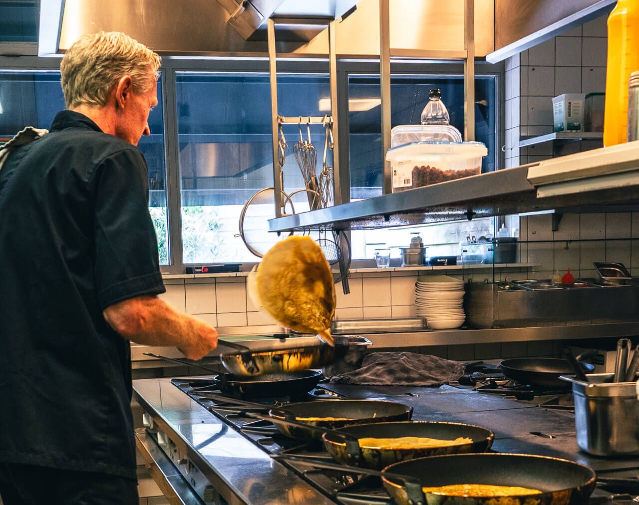 ‘Sinds 2017 ben ik eigenaar van restaurant Strends End. Een geweldige kans, waar ik geen moment spijt van heb. Als chef-kok stond ik al jaren in de keuken, onder meer bij een pannenkoekrestaurant van Texelse collega’s. Een lekkere pannenkoek bakken zit mij dus in de vingers! Mijn geheim? Dat ga ik niet prijsgeven, maar de verse melk van Zuivelboerderij Texel is beslist goud waard. Ik verras de gasten graag met speelse variaties. Lamsham, schapenkaas, aardbeien… Texelse producten mogen niet ontbreken. Ik serveer trouwens met evenveel plezier een sliptong of spareribs. Ons team maakt van élke maaltijd een klein feestje.’
